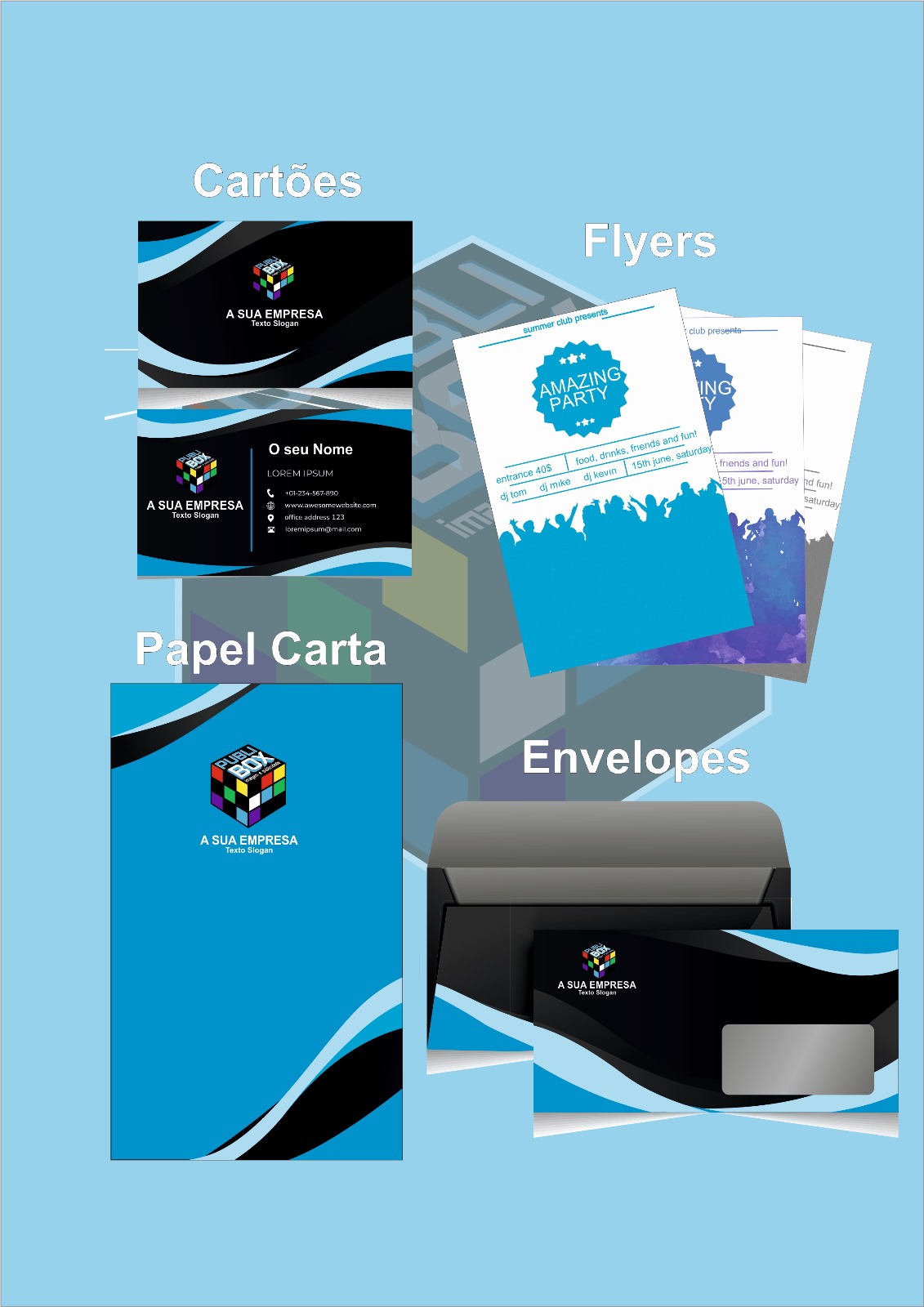 Conceção e impressão de papel timbrado, cartões de visita, envelopes e outros materiais de escritório com identidade visual consistente.